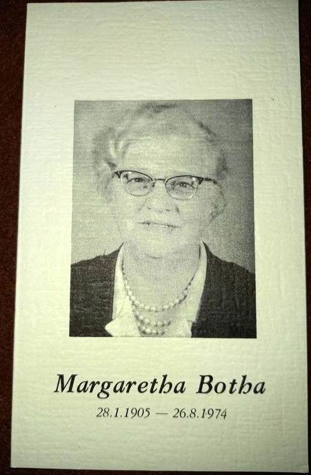 Geneem vanaf Facebook South Africa Funeral Letters/Begrafnisbriewe. Erkenning vir die bydrae aan: Carel Johann de Bruin 18 Oct 2021_8 – Margaretha Botha 1905-1974. Dankie sê kaart na begrafnis