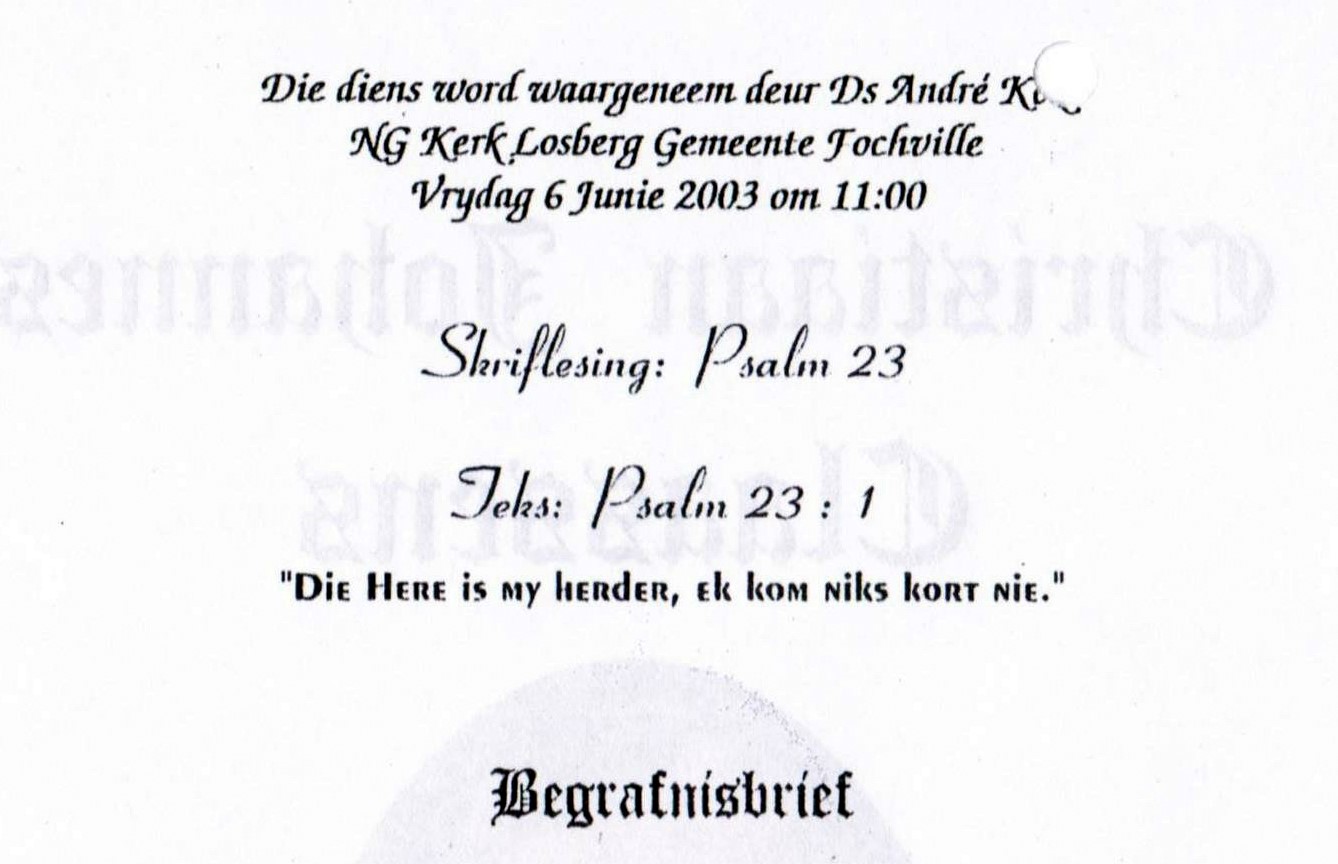 Volgens E-mail ontvang vanaf Lourens De Jager gedateer 20260118 die volgende addisionele info: Goeiedag Hendrik, Ek heg die begrafnisbrief van Christiaan Johannes(Chrisjan) CLAASSENS aan. Hy was die seun van Jacobus William (Koos) CLAASSENS (2 Aug 1897- 16 Mei 1978) en Regina Catharina (Katriena) KLEYNHANS(4 Mrt 1901- 3 Apr 1983). In die CLAAS(S)EN geslagsregister (bl.697) is hy gelys as: A2b4c10d1e4f5g5h4i1 (nommer 16251) (Claassen, N. & Claassen,G.H. Die Claas(s)en afstammelinge in Suid-Afrika. 2001). Hy is op 10 Mrt 1943 te Brits getroud met Alida Johanna(Alida) SWIEGERS. Vriendelike Groete, Christiaan Lourens (Lourens) de Jager
