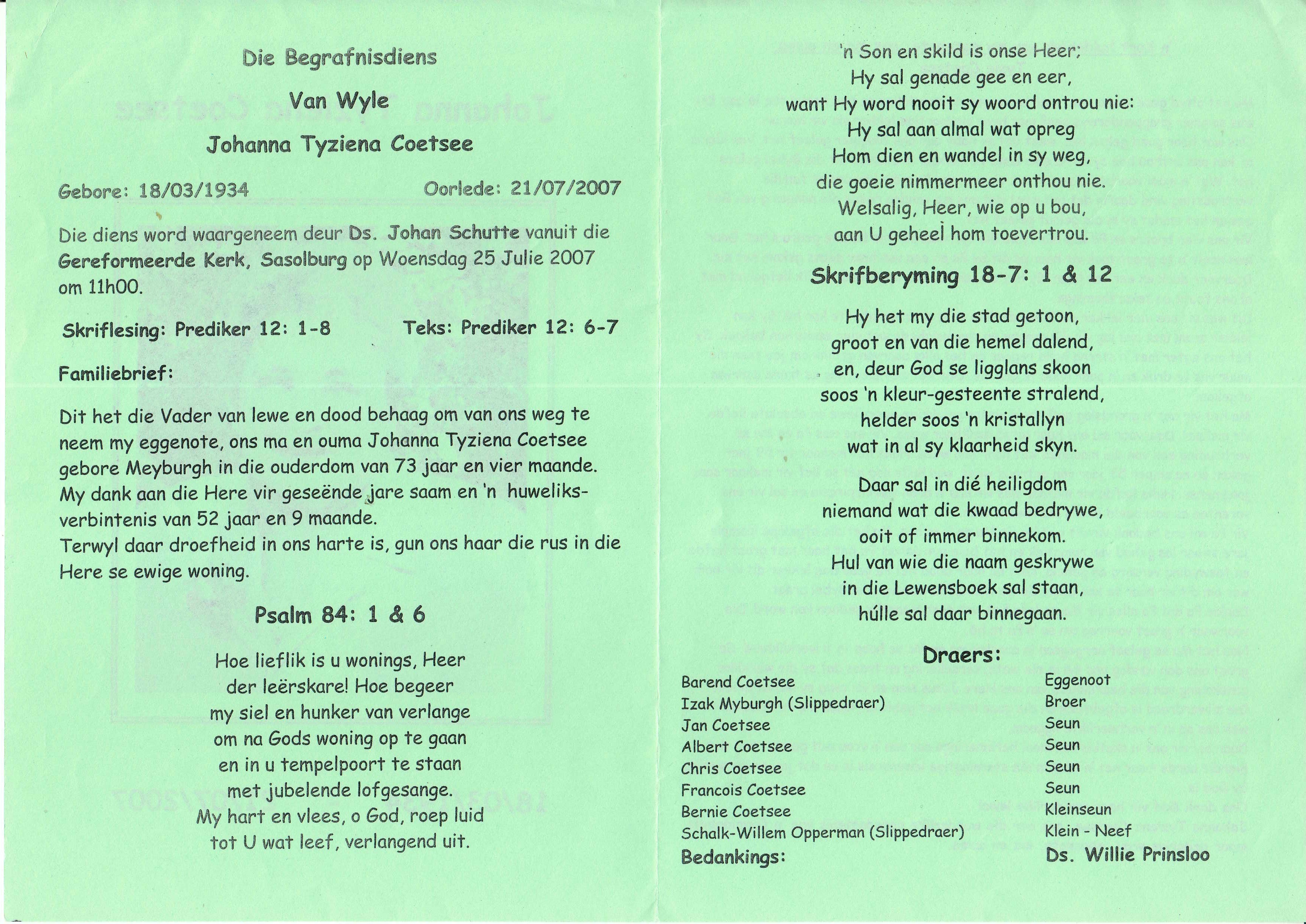 Funeral Programs / Begrafnisbriewe