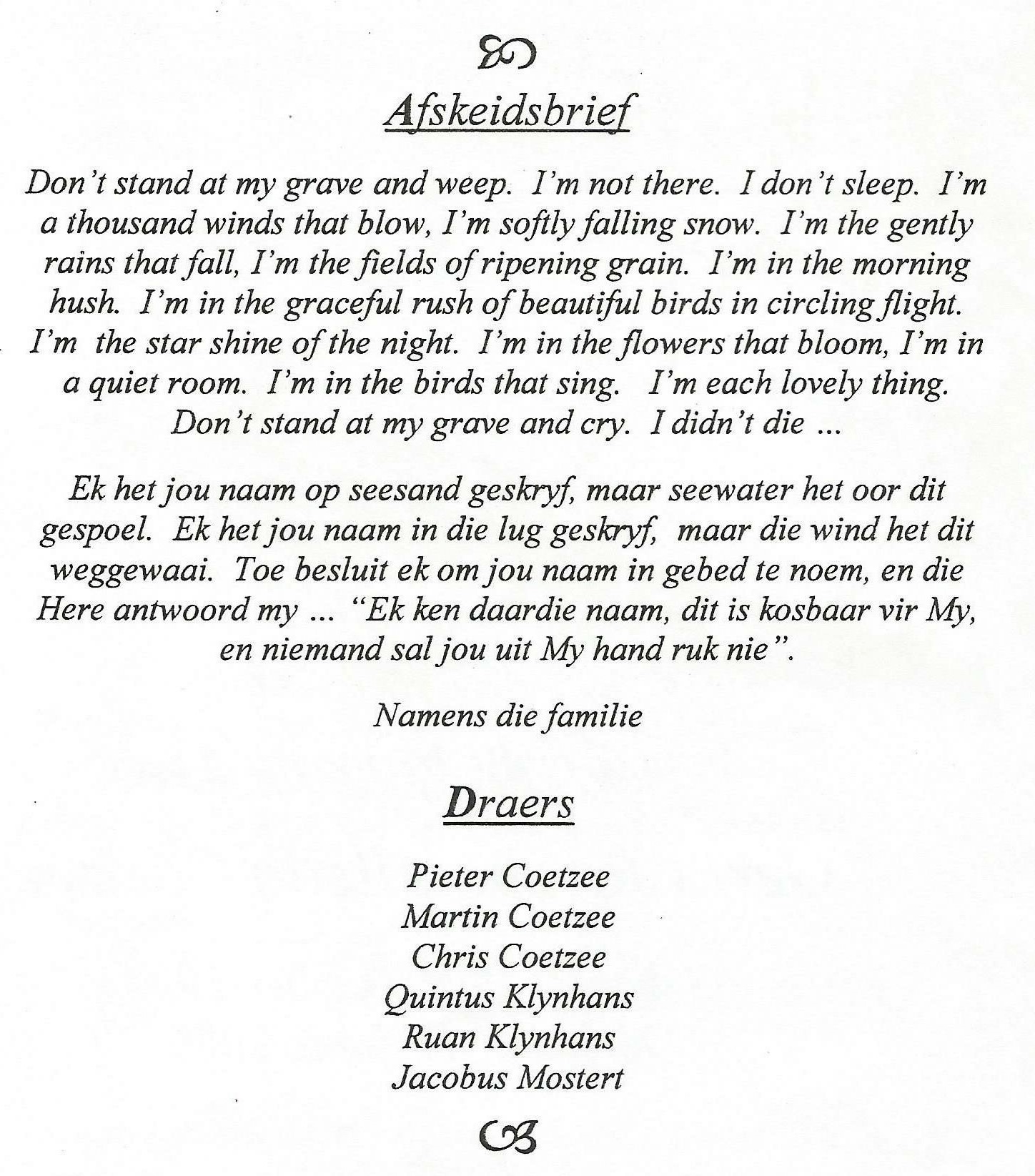 Funeral Programs / Begrafnisbriewe