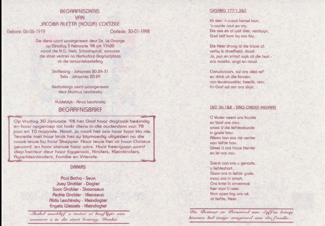 Funeral Programs / Begrafnisbriewe