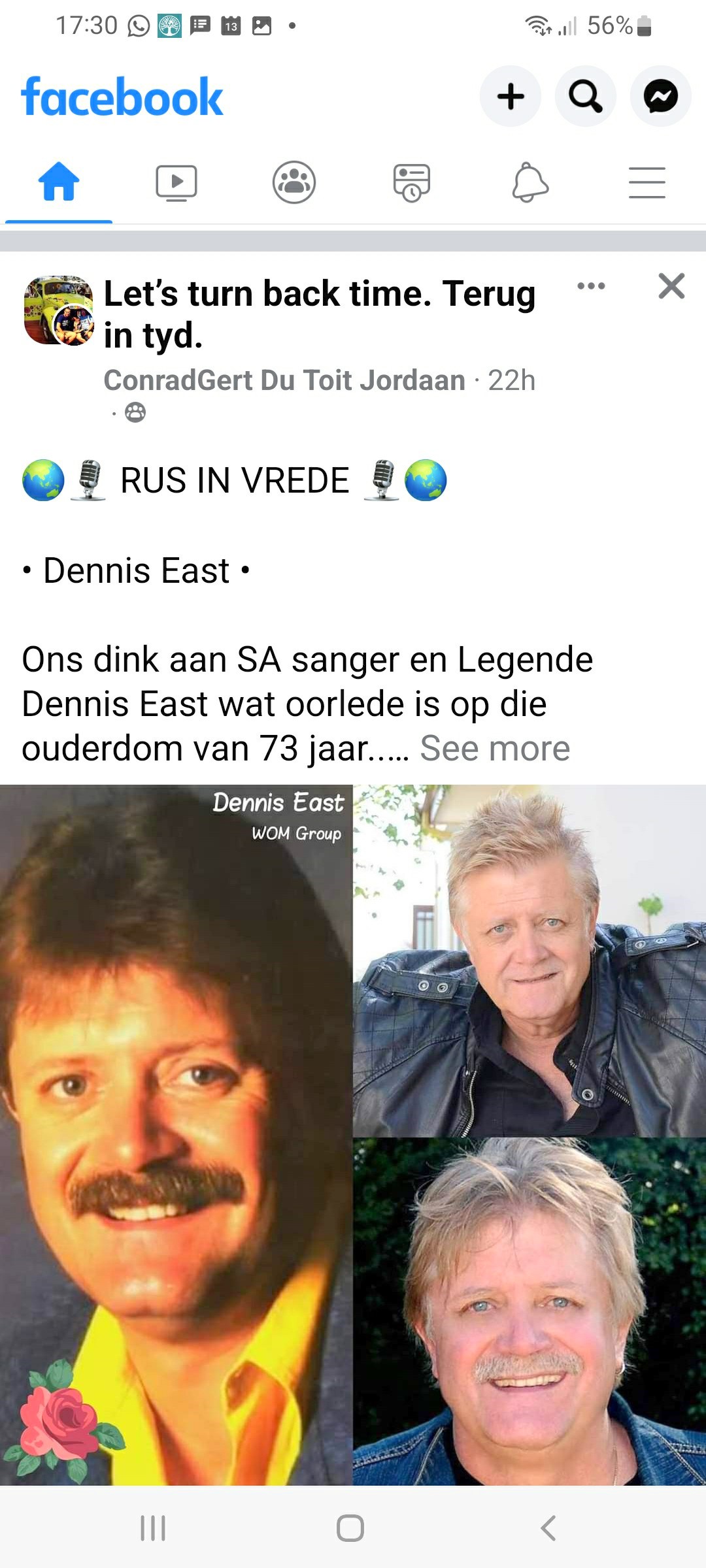 Ons dink aan SA sanger en Legende Dennis East wat oorlede is op die ouderdom van 73 jaar Dennis het in die laat 60s sy musiek loopbaan begin en opgetree saam met The Rising Sons in die laat 70s Dennis was bekend vir sy treffers soos “Dammit I love you / a Million drums / a Rose has to Die” en vele meer Dennis was ook n bekende liedjieskrywer en album vervaardiger vir ander kunstenaars Dennis het Vrydag n beroerte gehad en is vanoggend oorlede