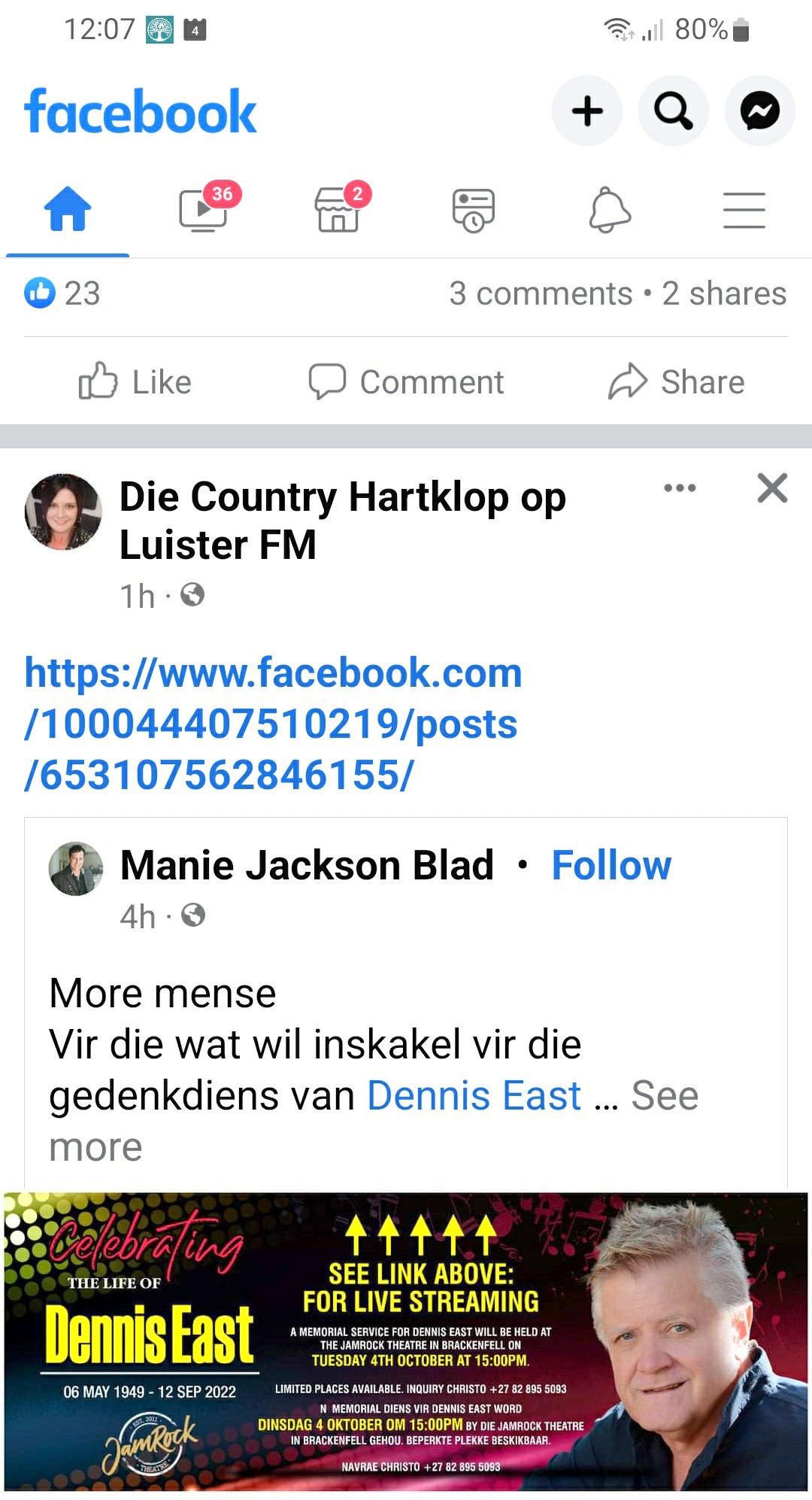 Ons dink aan SA sanger en Legende Dennis East wat oorlede is op die ouderdom van 73 jaar Dennis het in die laat 60s sy musiek loopbaan begin en opgetree saam met The Rising Sons in die laat 70s Dennis was bekend vir sy treffers soos “Dammit I love you / a Million drums / a Rose has to Die” en vele meer Dennis was ook n bekende liedjieskrywer en album vervaardiger vir ander kunstenaars Dennis het Vrydag n beroerte gehad en is vanoggend oorlede