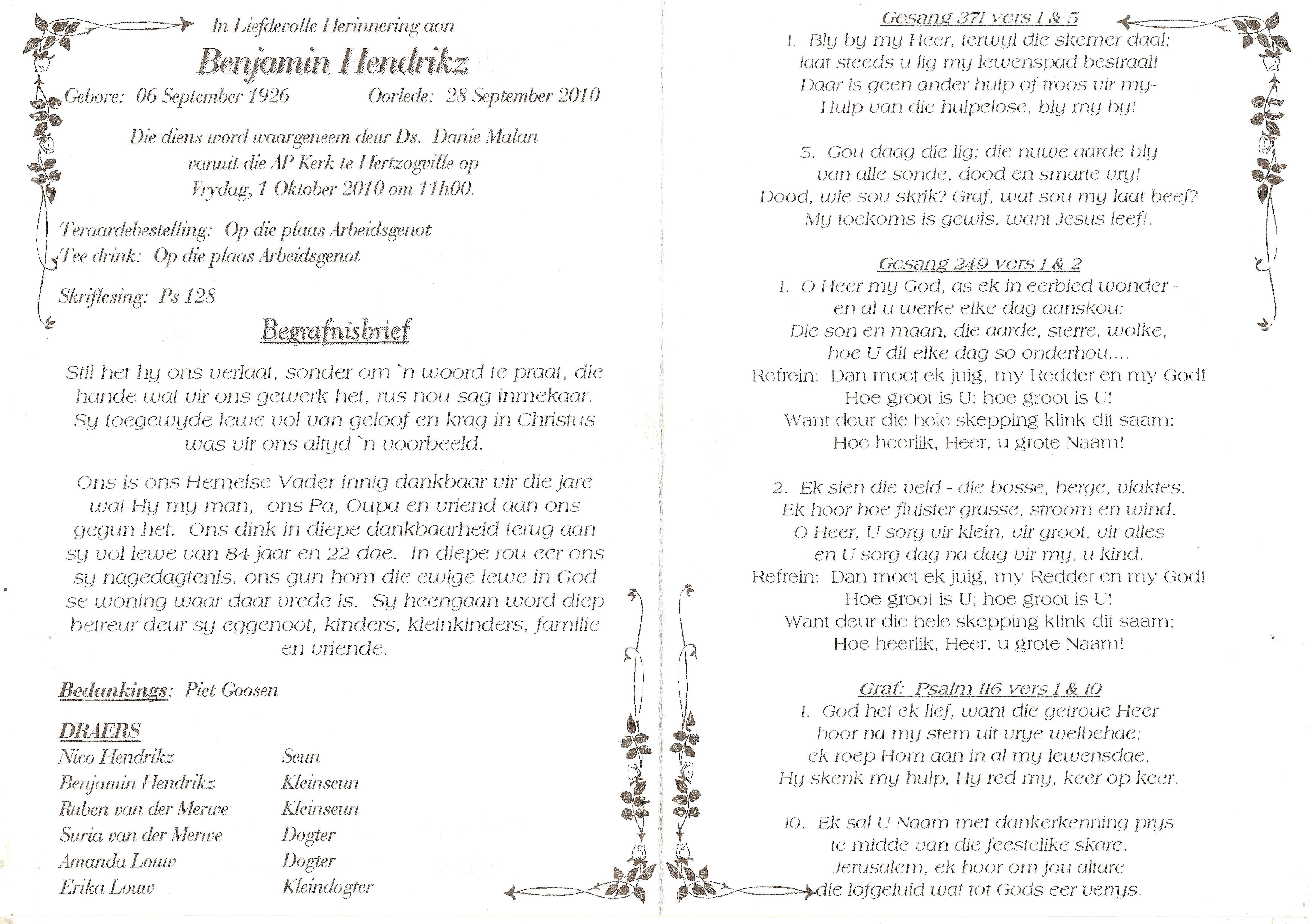 Funeral Programs / Begrafnisbriewe