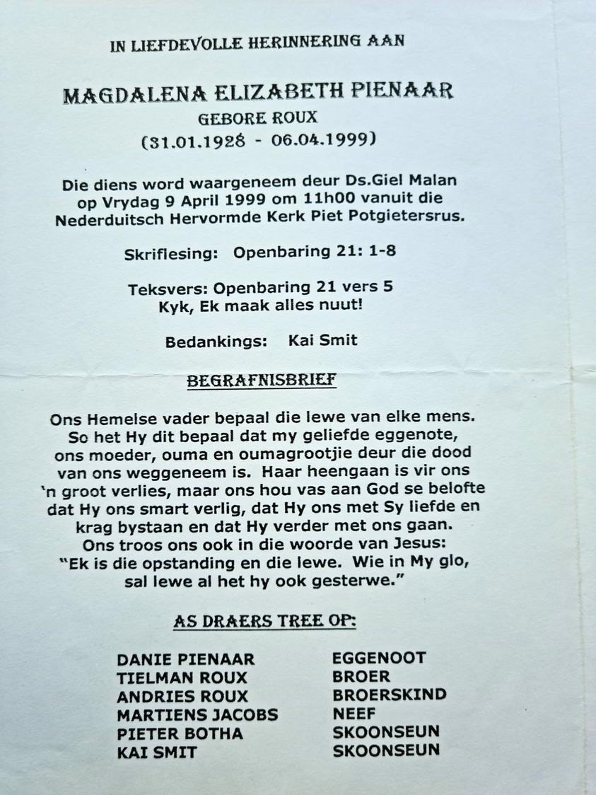 Genéem vanaf Facebook “South Africa Funeral Letters_Begrafnisbriewe”. Erkenning vir die bydrae aan: Alta Du Buson Roux_8 Jan 2022_78_Magdalena Elizabeth PIENAAR née-Roux 1928-1999