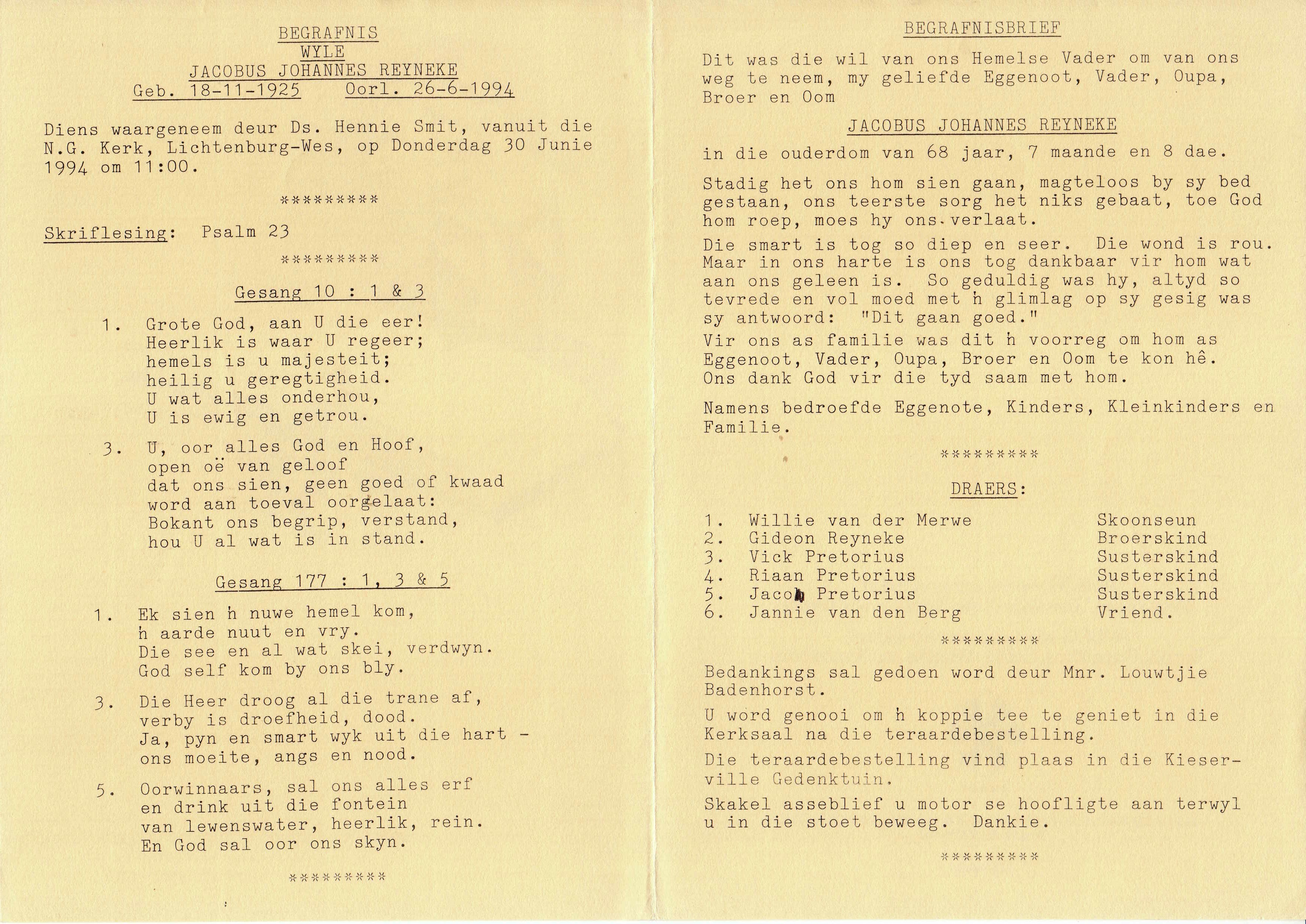 Funeral Programs / Begrafnisbriewe