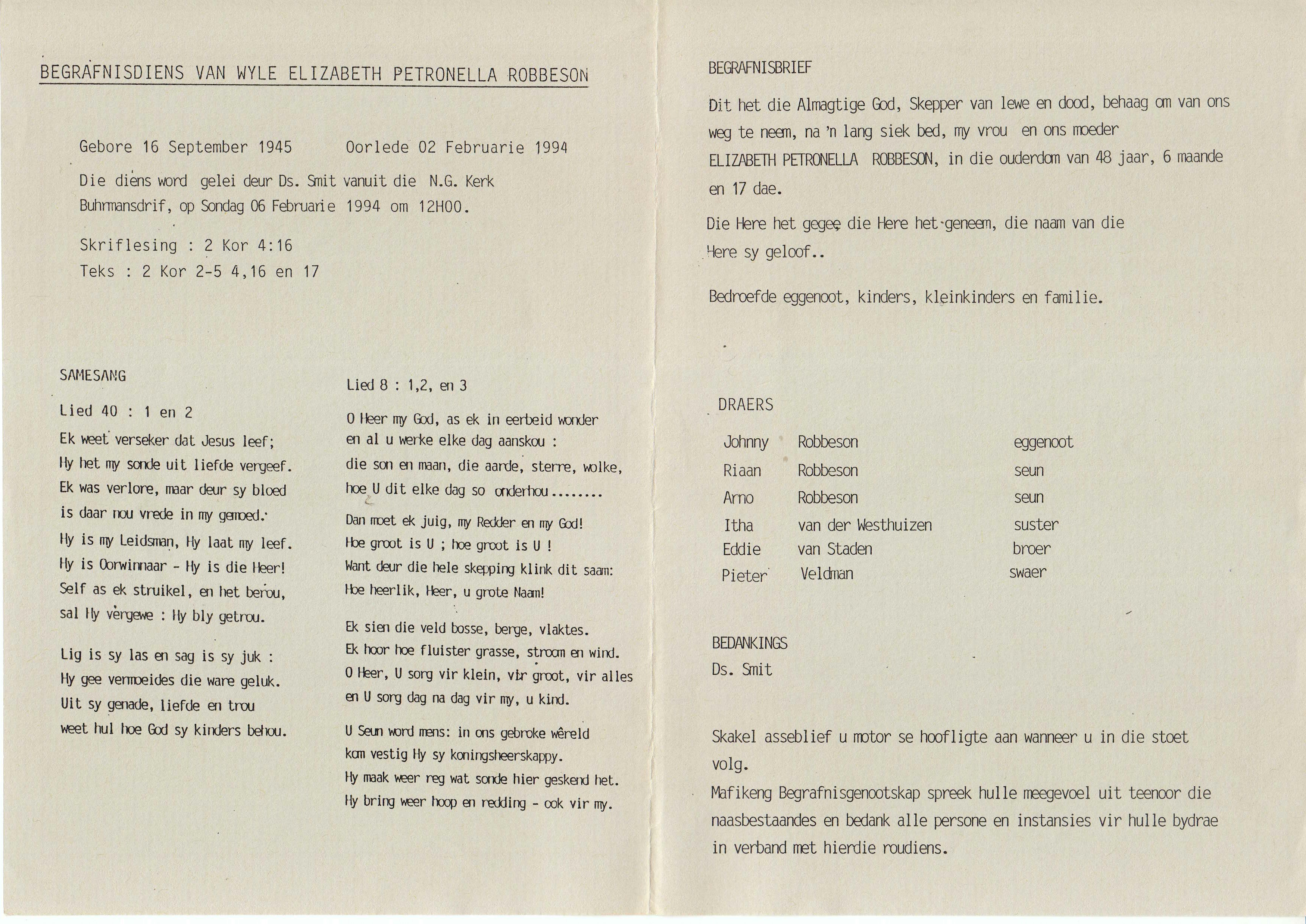 Funeral Programs / Begrafnisbriewe