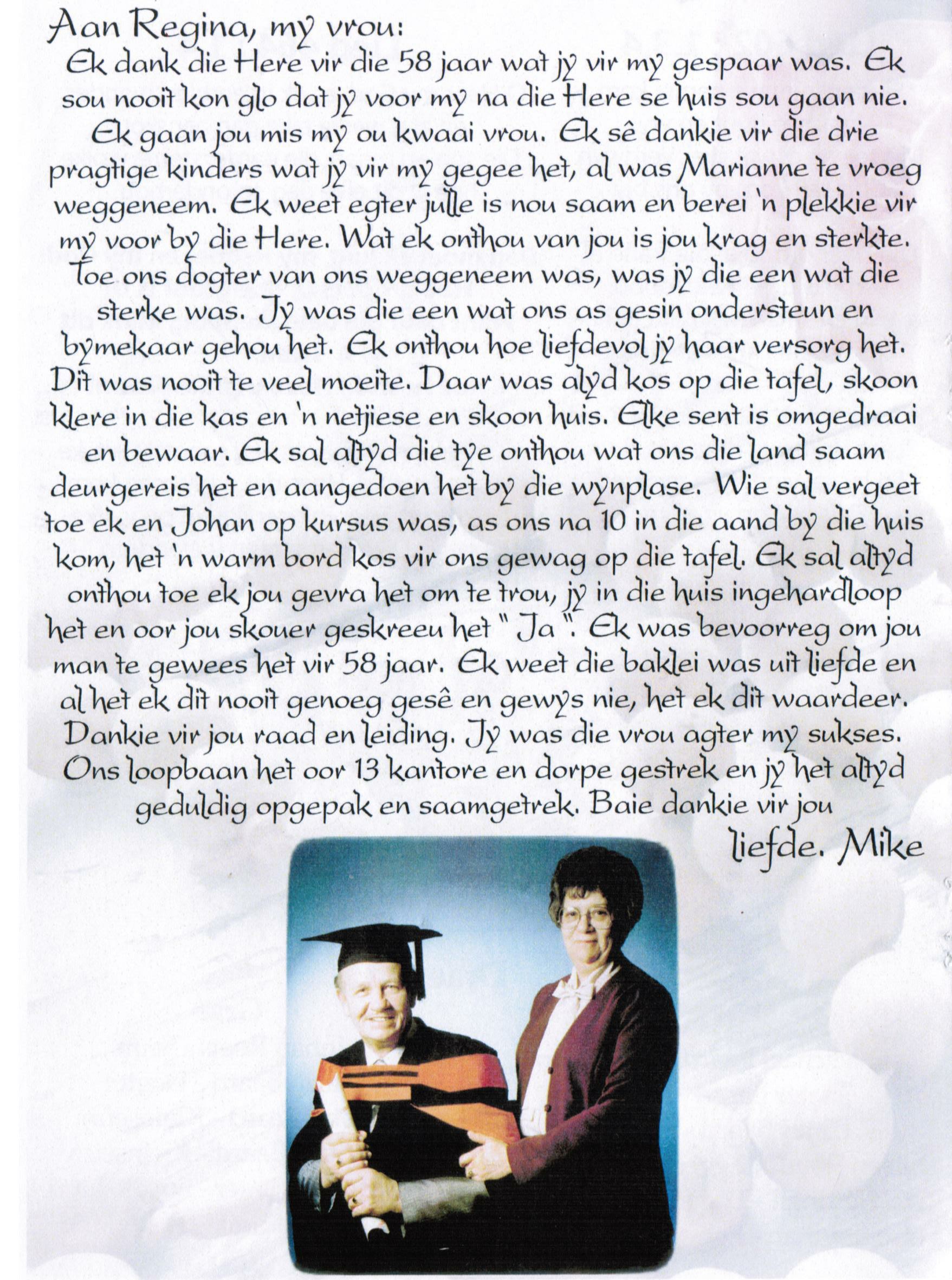 Volgens E-mail ontvang vanaf Lourens De Jager gedateer 20260115 die volgende addisionele info: Goeie dag Hendrik Sien aangeheg die begrafnisbrief van Regina Catharina Roets (Geb. CLAASSENS). Sy was die jongste kind van Jacobus William (Koos) CLAASSENS (2 Aug 1897- 16 Mei 1978) en Regina Catharina (Katriena) KLEYNHANS(4 Mrt 1901- 3 Apr 1983) In die CLAAS(S)EN geslagsregister (bl.697) is sy gelys as: A2b4c10d1e4f5g5h4i5 (nommer 16255) (Claassen, N. & Claassen,G.H. Die Claas(s)en afstammelinge in Suid-Afrika. 2001.) Sy is vernoem na haar ma- wat op haar beurt weer vernoem is na haar ouma Regina Catharina Celliers. Haar man Johannes Cornelius Michael (Mike) Roets was 'n landros gewees. Vriendelike Groete, Christiaan Lourens (Lourens) de Jager