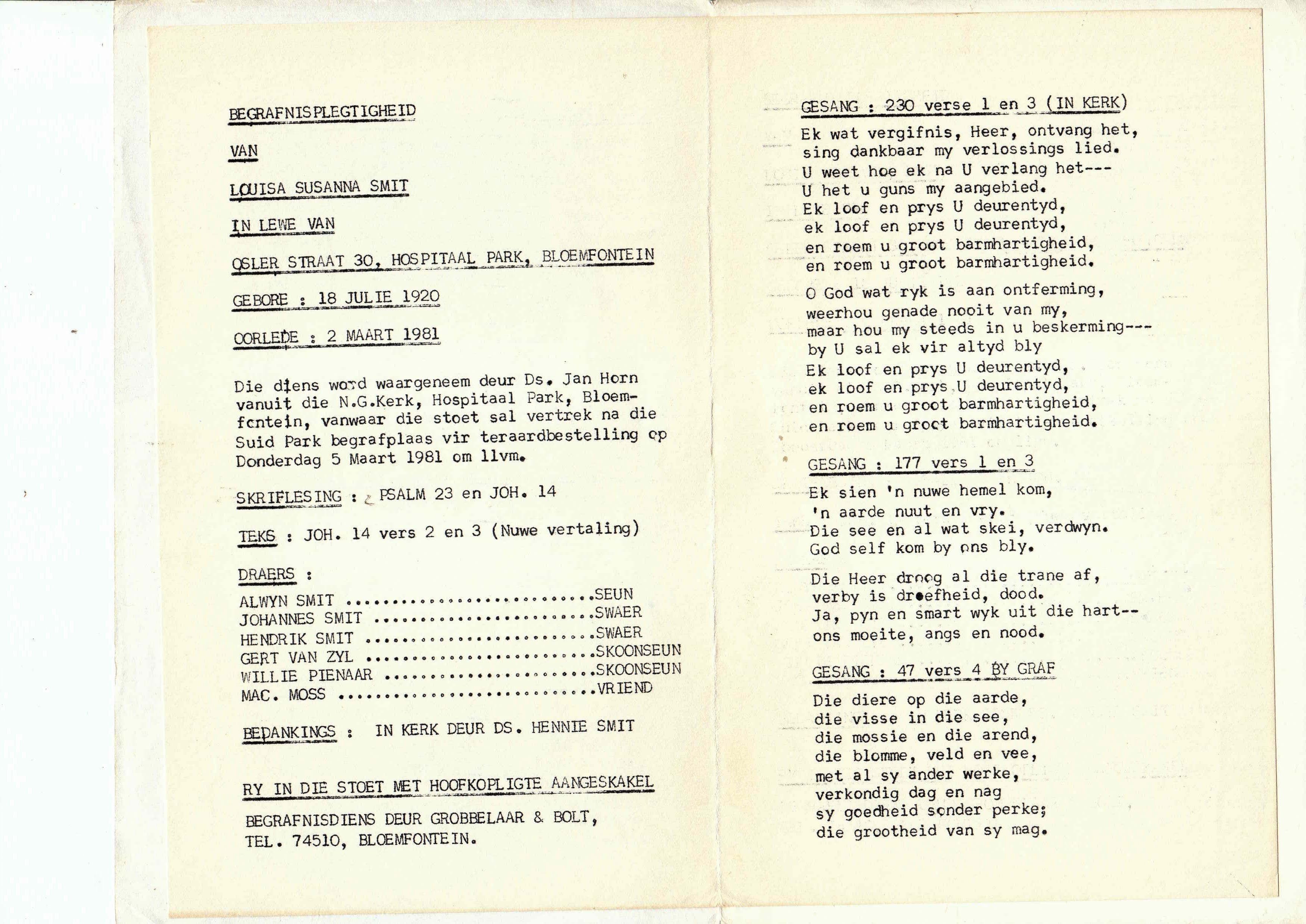 Funeral Programs / Begrafnisbriewe
