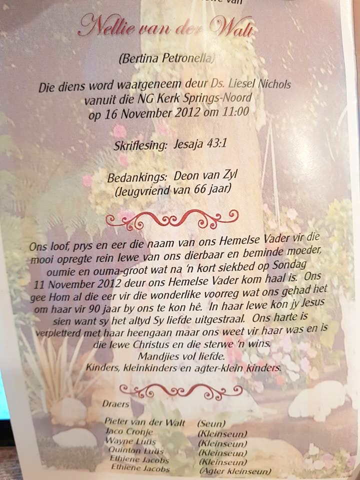 Geneem vanaf Facebook South Africa Funeral Letters/Begrafnisbriewe. Erkenning vir die bydrae aan: Alec Waldeck 8 Oct 2021_113/_114 – Nellie van der Walt. Bertina Petronella Mulder Pearson 2/9/1922 - 11/11/2012. Familysearch G89K-HX5. Sy was die dierbaarste mens en die orreliste by die NG Kerk Springs-Noord