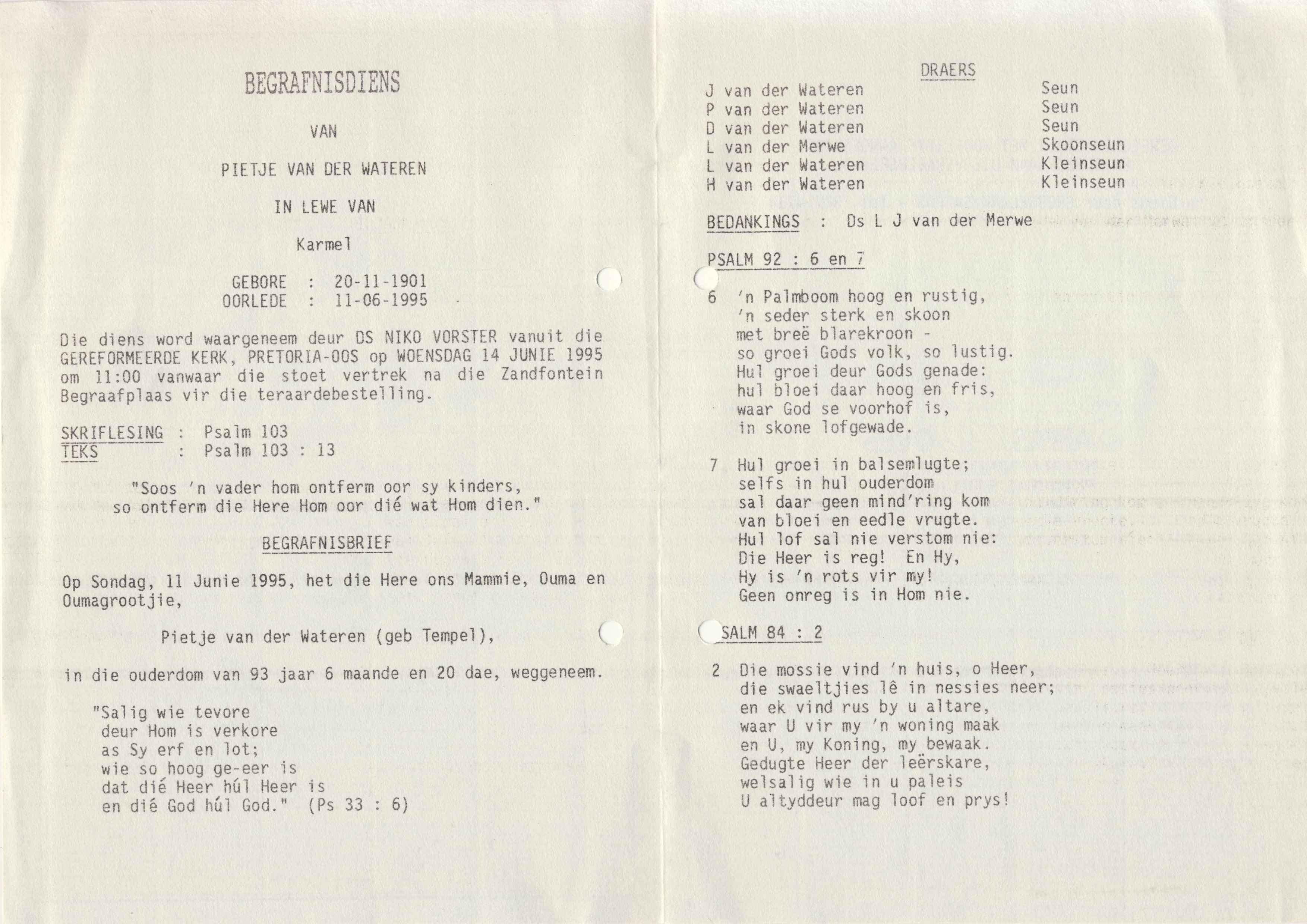 Funeral Programs / Begrafnisbriewe
