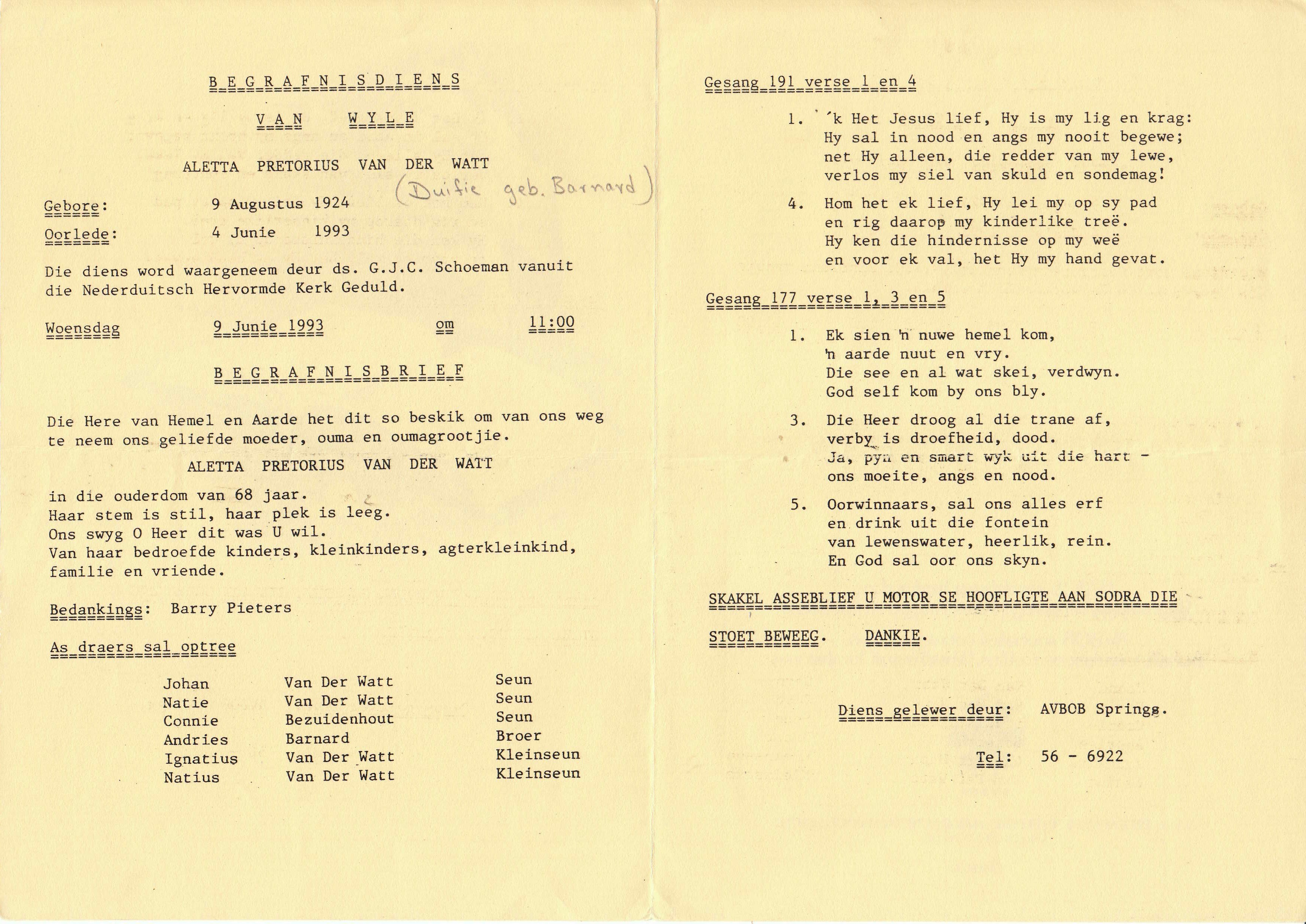 WATT-VAN-DER-Aletta-Pretorius-Nn-Duifie-nee-Barnard-1924-1993-F