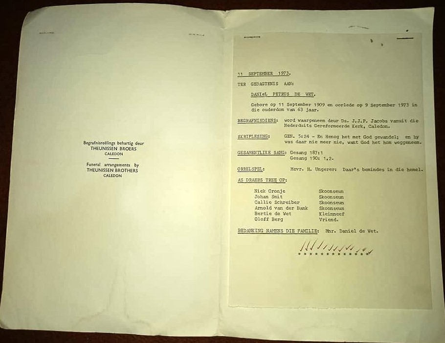 Geneem vanaf Facebook South Africa Funeral Letters/Begrafnisbriewe. Erkenning vir die bydrae aan: Carel Johann de Bruin 18 Oct 2021_67/_68 – Daniël Petrus De Wet 1909-1973