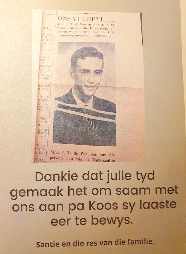Genéem vanaf Facebook “South Africa Funeral Letters_Begrafnisbriewe”. Erkenning vir die bydrae aan: Paul Minnaar_16 Jan 2022_224/225/226/227/228/229/230/231/232/233/234_Jacobus Tancred Nn Koos DE WET 1938-2022. My eerste werkgewer, genealogie vriend vir byna 25 jaar. So jammer hy het nooit sy genealogie kennis opgeteken nie, nou is dit vir ons velore ... Rus in vrede