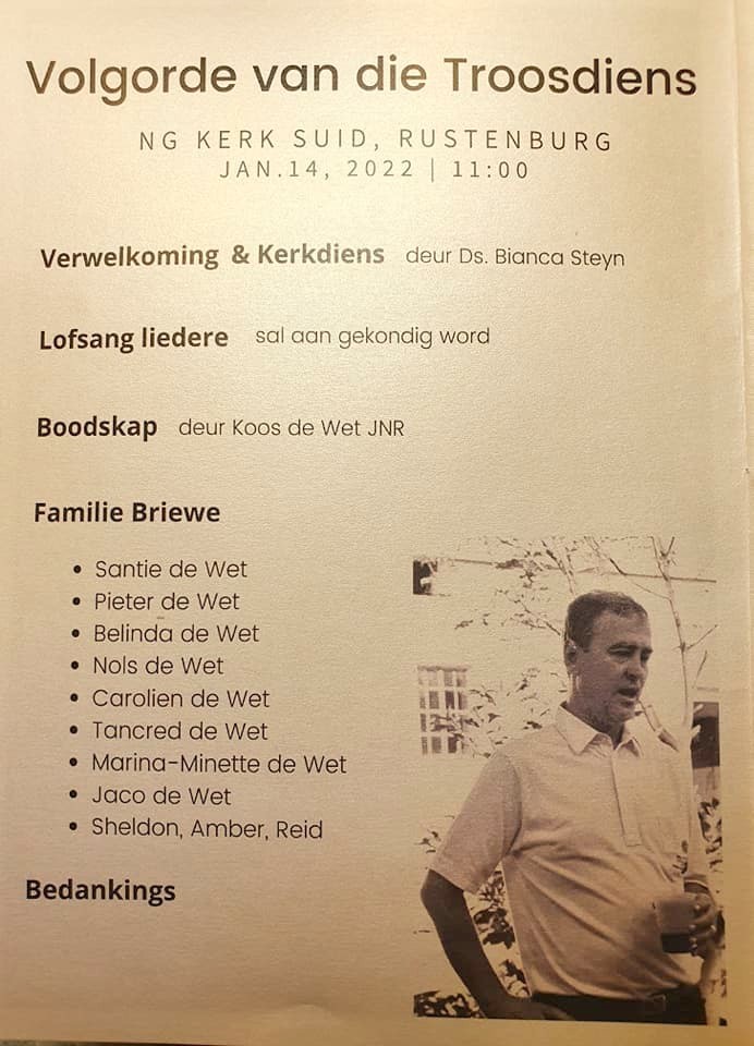 Genéem vanaf Facebook “South Africa Funeral Letters_Begrafnisbriewe”. Erkenning vir die bydrae aan: Paul Minnaar_16 Jan 2022_224/225/226/227/228/229/230/231/232/233/234_Jacobus Tancred Nn Koos DE WET 1938-2022. My eerste werkgewer, genealogie vriend vir byna 25 jaar. So jammer hy het nooit sy genealogie kennis opgeteken nie, nou is dit vir ons velore ... Rus in vrede