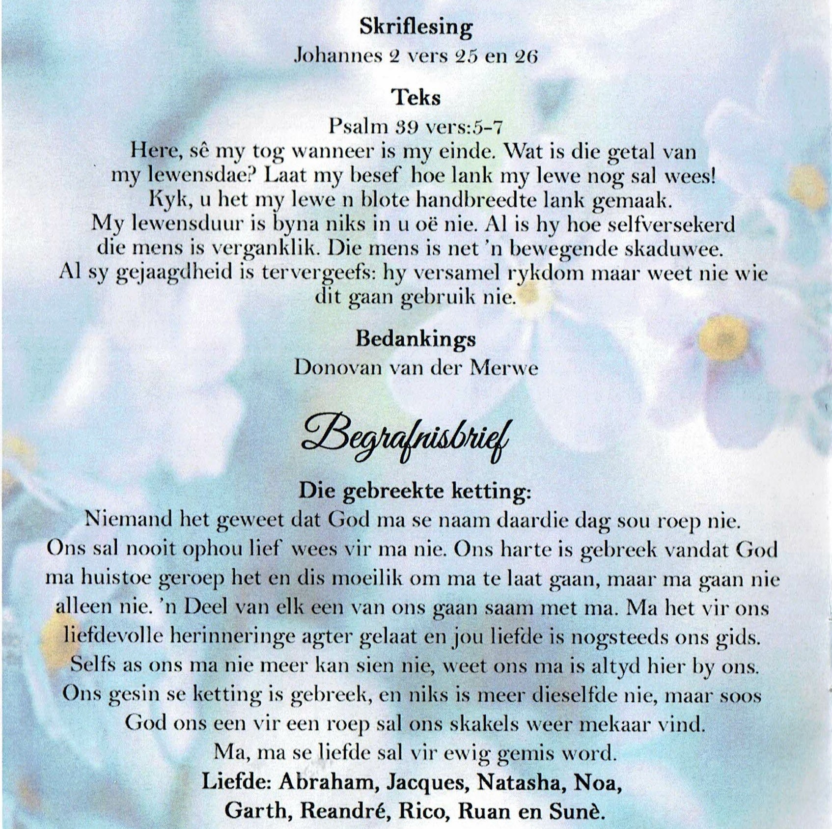 Funeral Programs / Begrafnisbriewe