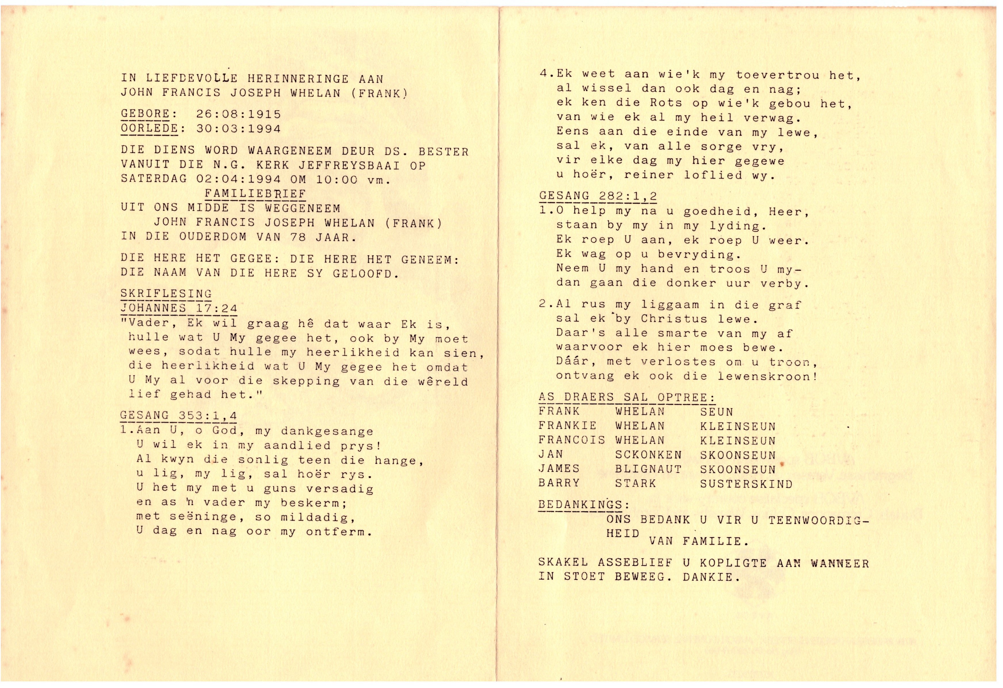 Funeral Programs / Begrafnisbriewe