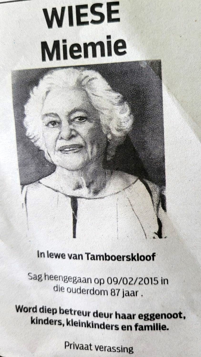 Genéem vanaf Facebook “South Africa Funeral Letters_Begrafnisbriewe”. Erkenning vir die bydrae aan: Lizelle De Koker Olivier_15 Jan 2022_158_Miemie WIESE b.0000 d.09.02.2015