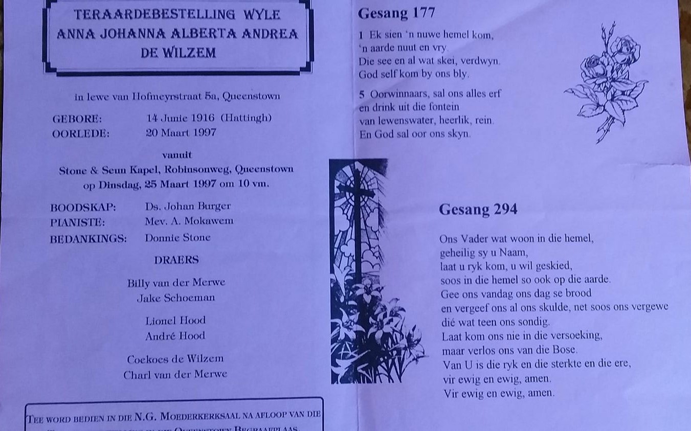 Genéem vanaf Facebook “South Africa Funeral Letters_Begrafnisbriewe”. Erkenning vir die bydrae aan: Georgette Coertzen_16 Jan 2022_214_Anna Johanna Alberta Andrea née-Hattingh DE WILZEM 1916-1997. Ongelukkig was dit op pienk gedruk, my Oupa Hattingh se suster