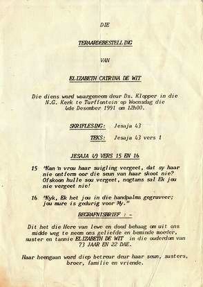 Geneem vanaf Facebook “South Africa Funeral Letters_Begrafnisbriewe”. Erkenning vir die bydrae aan: Christel De Lange_4 Nov 2021_118/119_Elizabeth Catrina DE WIT Nn-Babs-Nn-Baba-X-DeLange-née-Swart-b.9 Nov 1918–d.1 Dec 1991. Buried - Wes Park Graveyard. Pallbearers - Raymond Jordaan, Pierre Jordaan, Ian Smith, Sheridan Smith, Jannie Delport, Jannie Swart