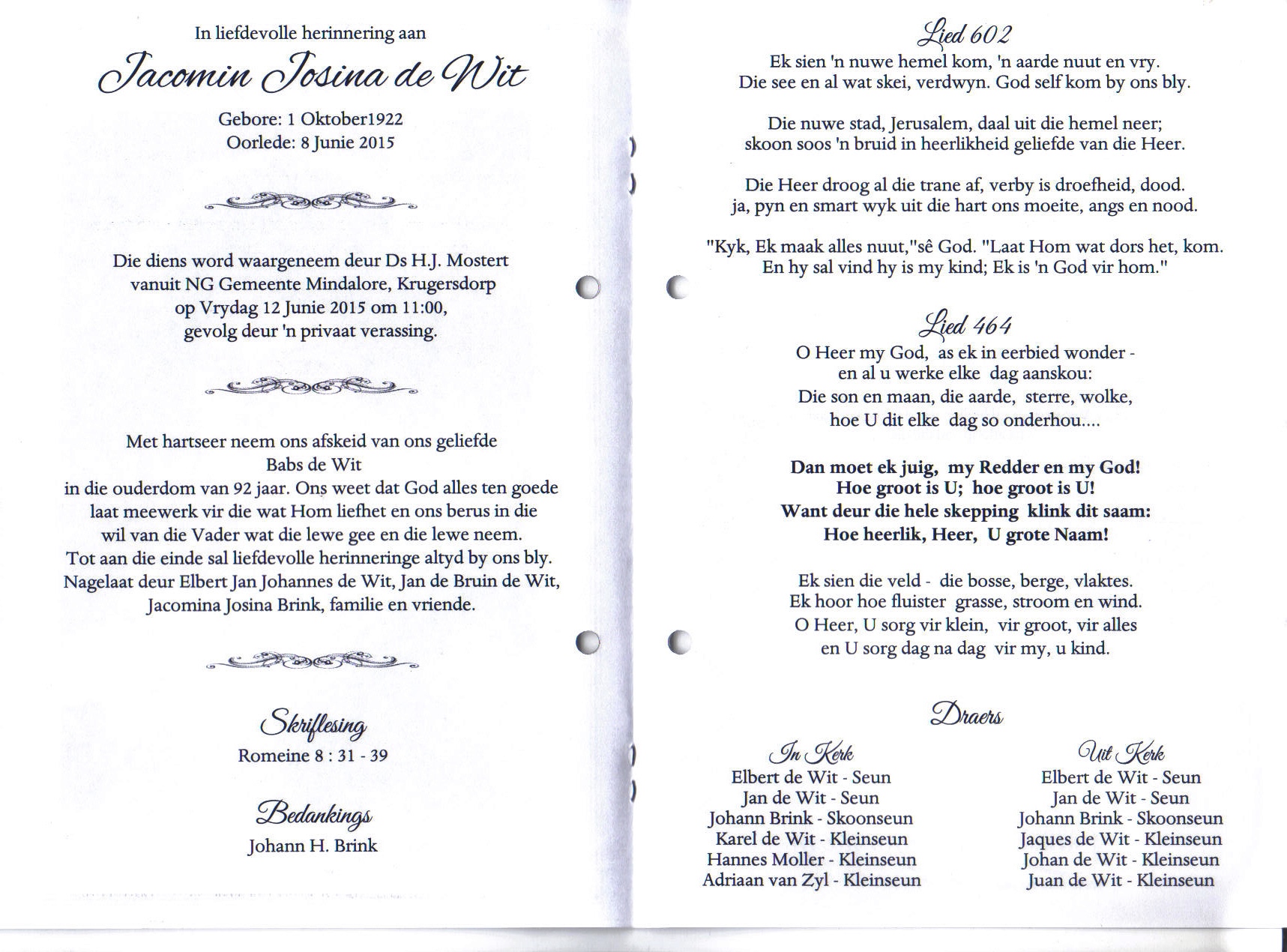 Funeral Programs / Begrafnisbriewe