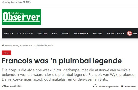 https://www.citizen.co.za/middelburg-observer/news/2023/11/20/francois-was-n-pluimbal-legende/?fbclid=IwAR2QpNlOVdkVXyFYA4xonv70HooJsBb0TX7_StF7ZVR7zlkpX8FjTJZ0DxA