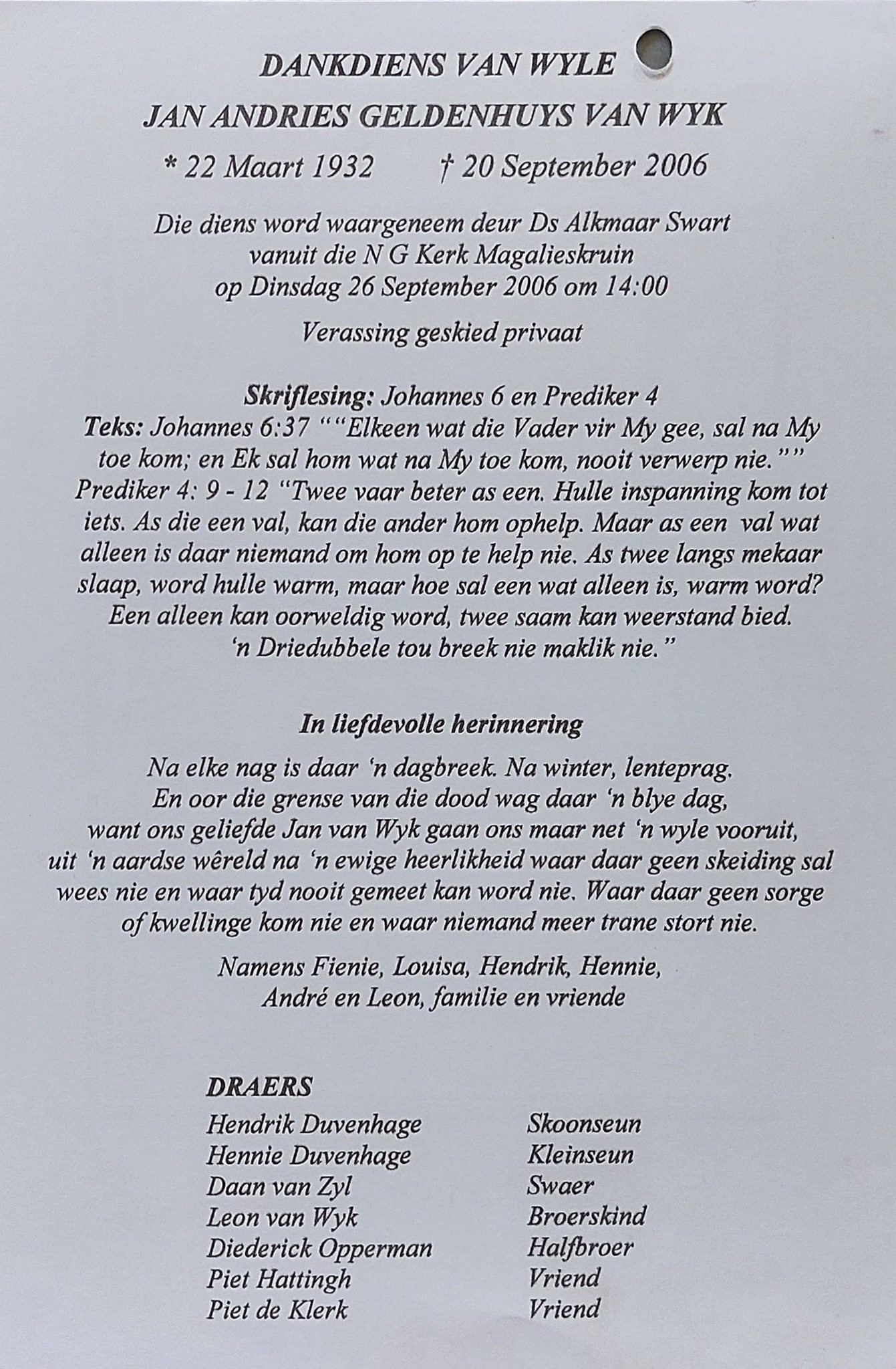 Funeral Programs / Begrafnisbriewe