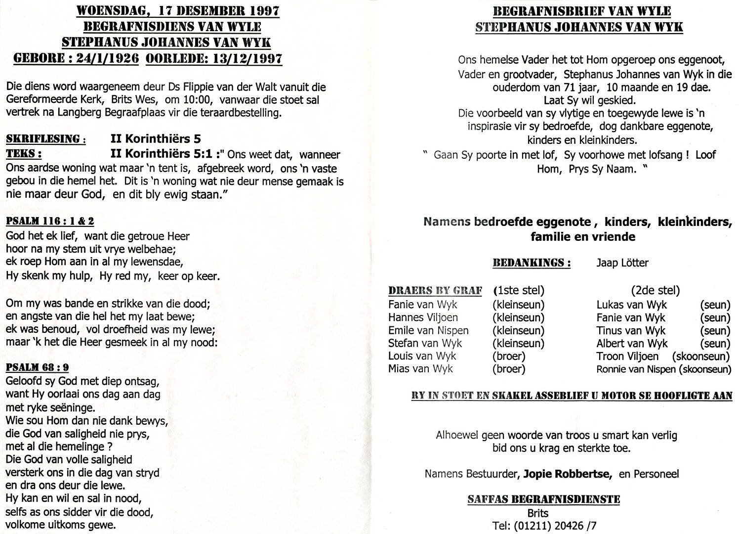 Funeral Programs / Begrafnisbriewe