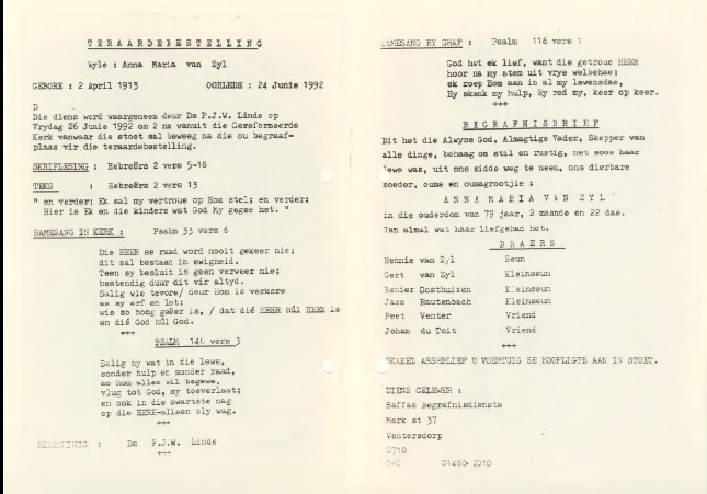 Funeral Programs / Begrafnisbriewe